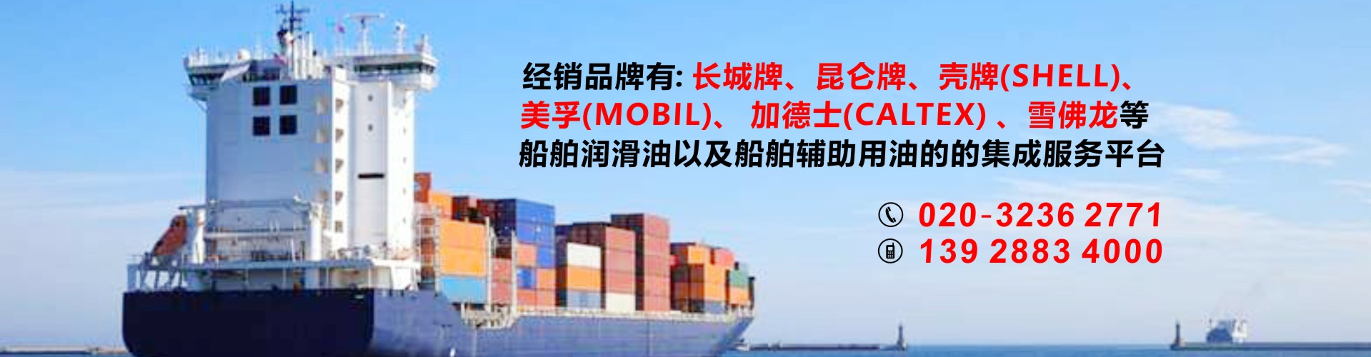 公司代理中石化長城潤滑油以及中石化國際品牌SINOPEC潤滑油,經銷品牌有昆侖牌、殼牌(SHELL)、美孚(MOBIL)、加德士(CALTEX)、雪佛龍(CHEVRON)是船舶潤滑油以及船舶輔助用油的的集成服務平臺,也可按照船東要求提供船舶消防救生用品、勞保用品、五金燈具及甲板用品等船舶配套產品。